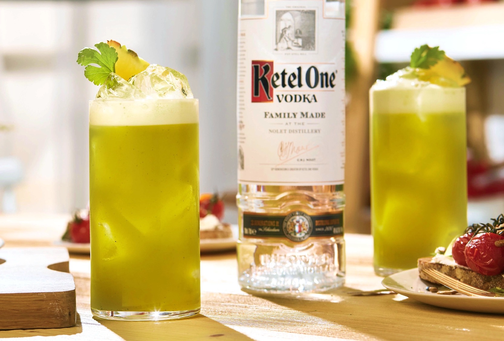 Take a clean Highball Glass, blend all ingredients in a juicer and poor over ice, finish with a mint bouquet.
