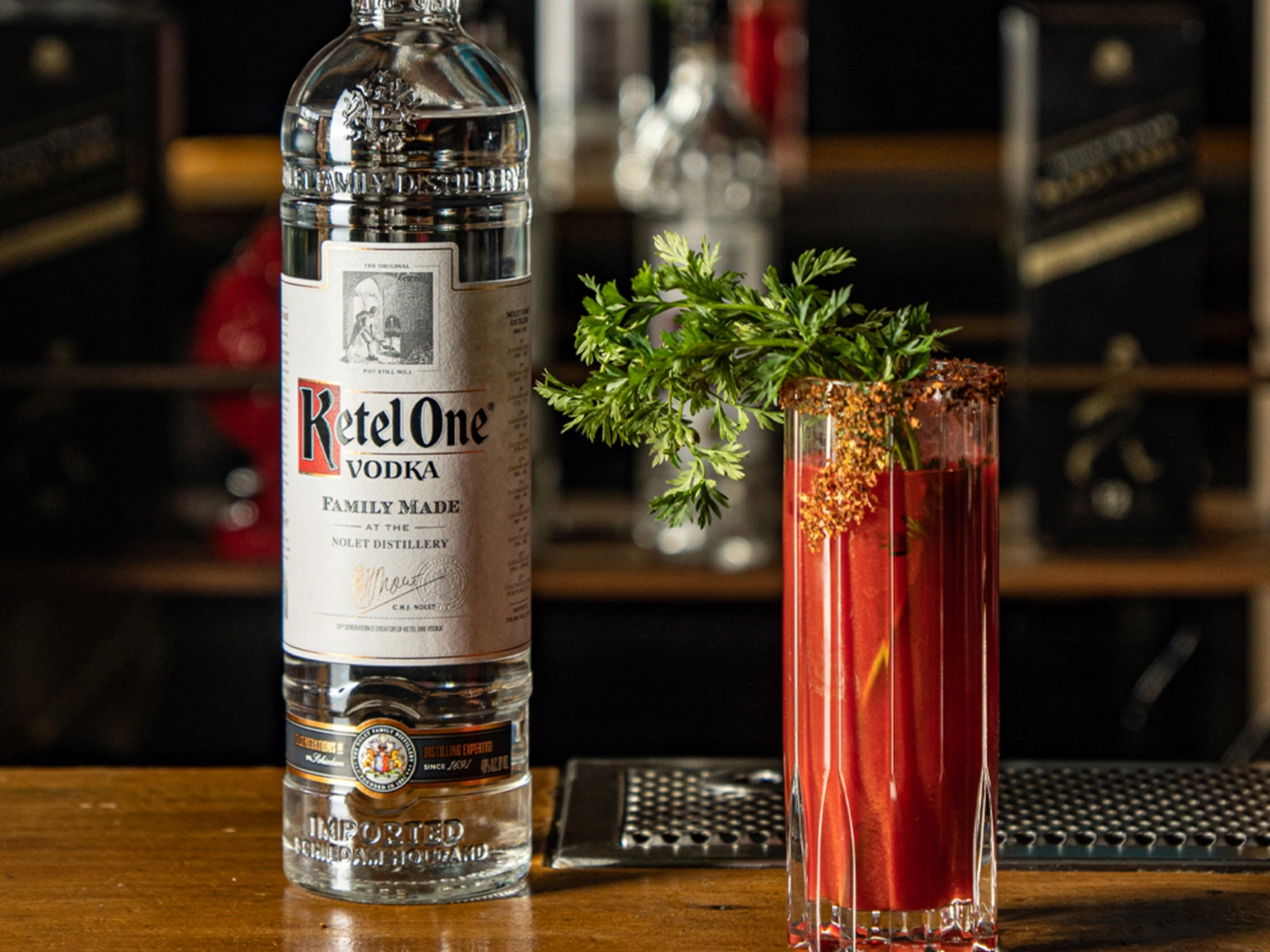 Mi cóctel está inspirado en un clásico Bloody Mary, pero con el agregado de zanahorias de temporada y el clásico pimiento verde tradicional de la cocina chilena, condimentado con salsa Worcester, salsa de ostras, pimienta negra, sal, salmuera de alcaparras, jarabe de pepinillos y limón, y acompañado de vodka Ketel One.