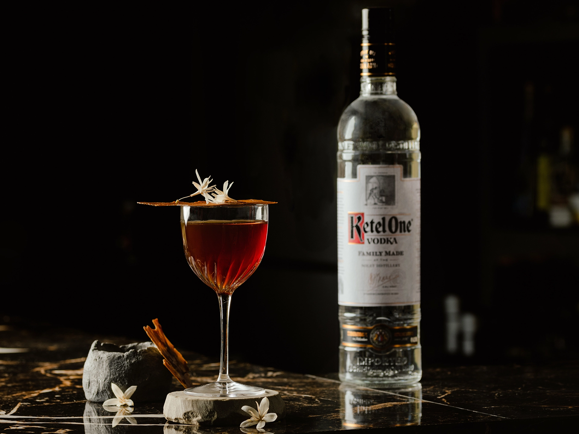 En un vaso mezclador, añadir Ketel One y Homemade Coffee Blend, hielo y remover uniformemente durante 35 segundos.Servir en un vaso frío Nick & Nora.Añadir la tuile encima del vaso y colocar dos flores de café