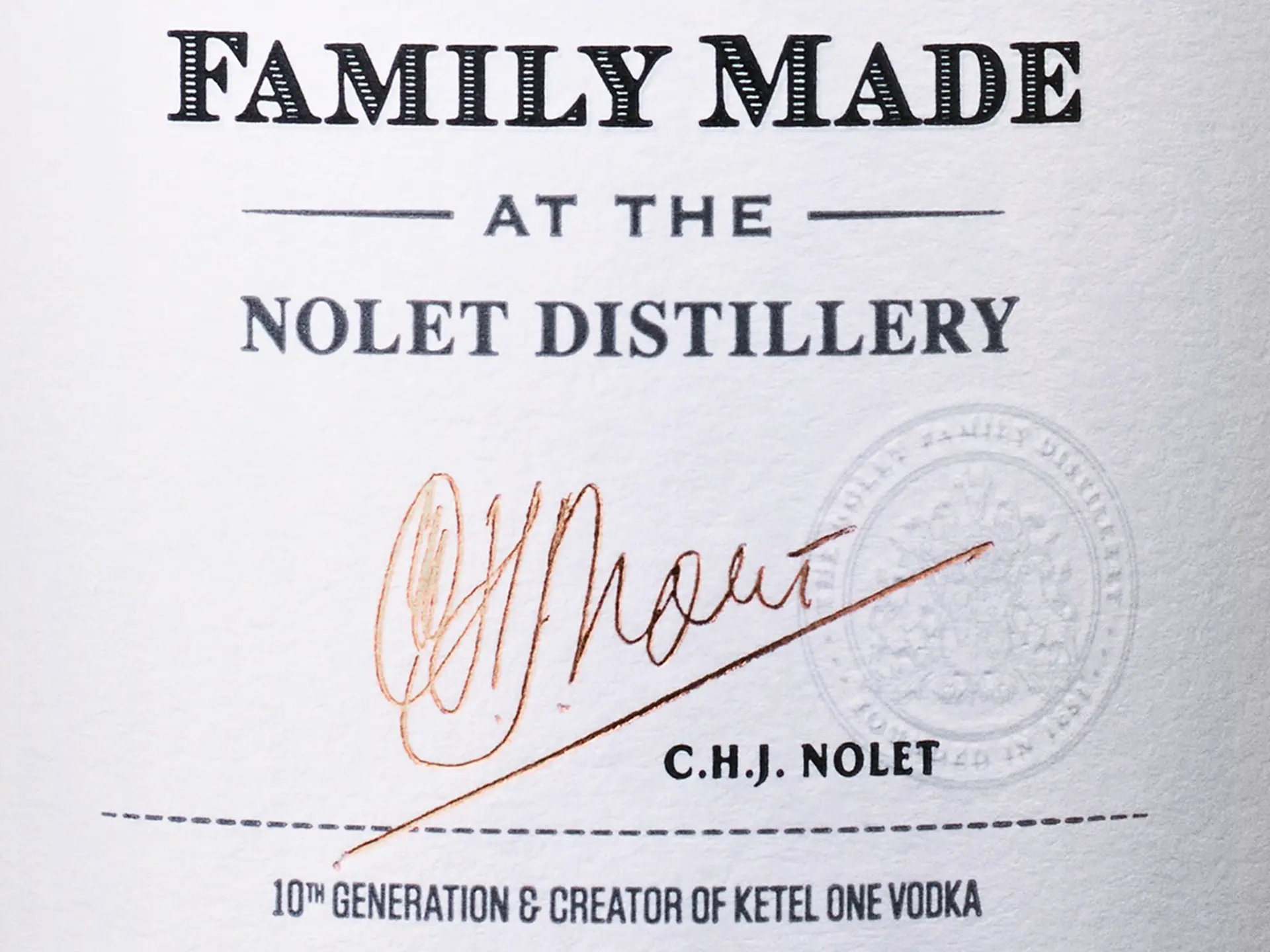 To guarantee the quality of the liquid, every batch of Ketel One Vodka is approved and signed off – quite literally – by a Nolet family member. And has been since the beginning. Currently, our bottle displays the signature of Carl Senior, a 10th generation Nolet.
